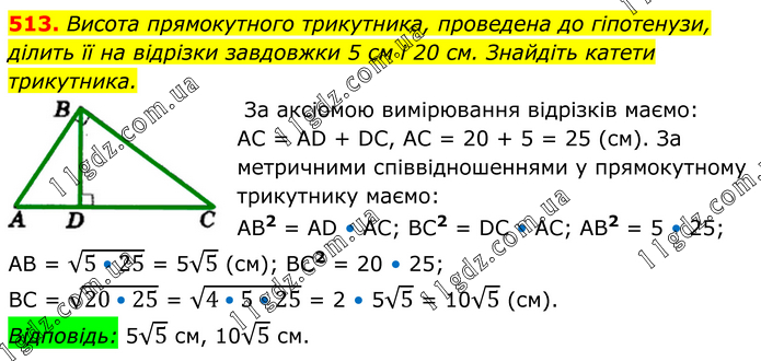 Висота прямокутного трикутника, проведена до гіпотенузи, ділить її на відрізки завдовжки 5 см і 20 см. Знайдіть катети трикутника. За аксіомою вимірювання відрізків маємо: АС = АD + DС, АС = 20 + 5 = 25 (см). За метричними співвідношеннями у прямокутному трикутнику маємо: АВ2 = АD • АС; ВС2 = DС • АС; АВ2 = 5 • 25; АВ = √(5•25) = 5√5 (см); ВС2 = 20 • 25; ВС = √(20•25) = √(4•5•25) = 2 • 5√5 = 10√5 (см). Відповідь: 5√5 см, 10√5 см.