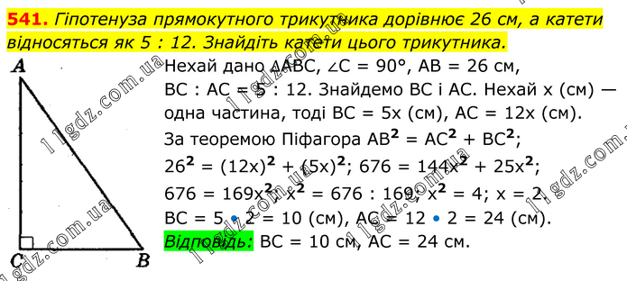 Гіпотенуза прямокутного трикутника дорівнює 26 см, а катети відносяться як 5 : 12. Знайдіть катети цього трикутника. Нехай дано ∆АВС, ∠С = 90°, АВ = 26 см, ВС : АС = 5 : 12. Знайдемо ВС і АС. Нехай х (см) — одна частина, тоді ВС = 5х (см), АС = 12х (см). За теоремою Піфагора АВ2 = АС2 + ВС2; 262 = (12x)2 + (5x)2; 676 = 144x2 + 25x2; 676 = 169х2; х2 = 676 : 169; х2 = 4; х = 2. ВС = 5 • 2 = 10 (см), АС = 12 • 2 = 24 (см). Відповідь: ВС = 10 см, АС = 24 см.