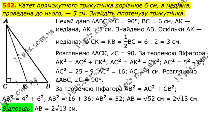 Катет прямокутного трикутника дорівнює 6 см, а медіана, проведена до нього, — 5 см. Знайдіть гіпотенузу трикутника. Нехай дано ∆АВС, ∠С = 90°, ВС = 6 см, АК — медіана, АК = 5 см. Знайдемо АВ. Оскільки АК — медіана, то СК = КВ = 1/2ВС = 6 : 2 = 3 см. Розглянемо ∆АСК, ∠С = 90. За теоремою Піфагора АК2 = АС2 + СК2; АС2 = АК2 – СК2; АС2 = 52 –З2; АС2 = 25 – 9; АС2 = 16; АС = 4 см. Розглянемо ∆АВС, ∠С = 90°. За теоремою Піфагора АВ2 = АС2 + СВ2; АВ2 = 42 + 62; АВ2 = 16 + 36; АВ2 = 52; АВ = √52 см = 2√13 см. Відповідь: АВ = 2√13 см.