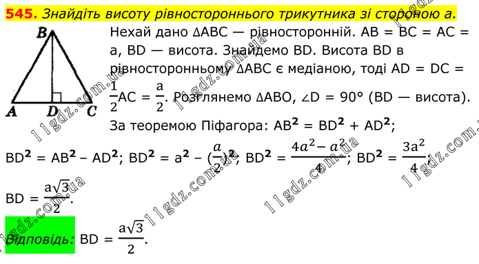Знайдіть висоту рівностороннього трикутника зі стороною а. Нехай дано ∆АВС — рівносторонній. АВ = ВС = АС = а, ВD — висота. Знайдемо ВD. Висота ВD в рівносторонньому ∆АВС є медіаною, тоді АD = DС = 1/2АС = a/2. Розглянемо ∆АВО, ∠D = 90° (ВD — висота). За теоремою Піфагора: АВ2 = ВD2 + АD2; ВD2 = АВ2 – АD2; ВD2 = a2 – (a/2)2; BD2 = (4a^2- a^2)/4; BD2 = (3a^2)/4; BD = (a√3)/2. Відповідь: BD = (a√3)/2.