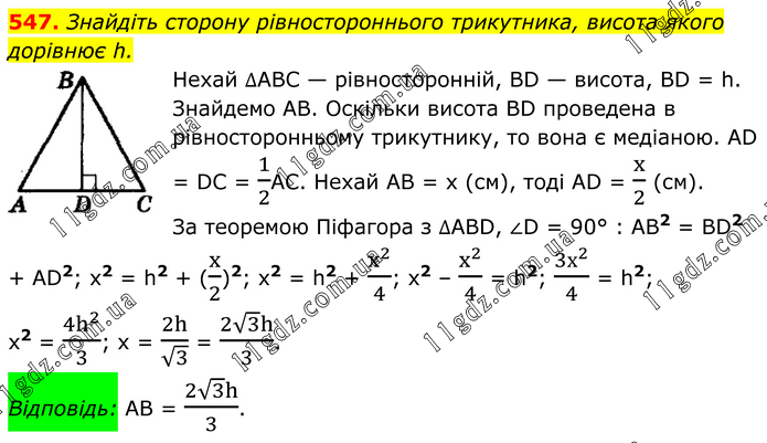 Знайдіть сторону рівностороннього трикутника, висота якого дорівнює h. Нехай ∆АВС — рівносторонній, ВD — висота, ВD = h. Знайдемо АВ. Оскільки висота ВD проведена в рівносторонньому трикутнику, то вона є медіаною. АD = DС = 1/2АС. Нехай АВ = х (см), тоді АD = x/2 (см). За теоремою Піфагора з ∆АВD, ∠D = 90° : АВ2 = ВD2 + АD2; x2 = h2 + (x/2)2; x2 = h2 + x^2/4; x2 – x^2/4 = h2; (3х^2)/4 = h2; x2 = (4h^2)/3; x = 2h/√3 = (2√3 h)/3. Відповідь: АВ = (2√3 h)/3.