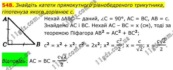 Знайдіть катети прямокутного рівнобедреного трикутника, гіпотенуза якого дорівнює с. Нехай ∆АВС — даний, ∠С = 90°, АС = ВС, АВ = с. Знайдемо АС і ВС. Нехай АС – ВС = х (см), тоді за теоремою Піфагора АВ2 = АС2 + ВС2; с2 = х2 + х2; с2 = 2х2; x2 = c^2/2; x = c/√2; x = (c√2)/2. Відповідь: АС = ВС = (c√2)/2.