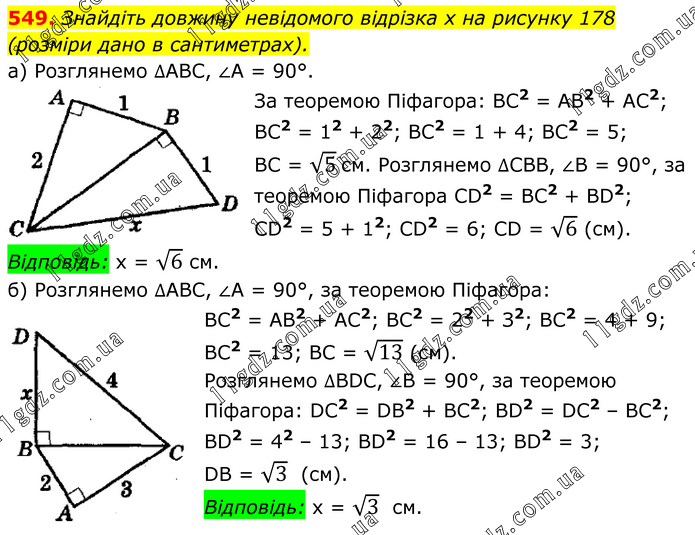 Знайдіть довжину невідомого відрізка х на рисунку 178 (розміри дано в сантиметрах). а) Розглянемо ∆АВС, ∠А = 90°. За теоремою Піфагора: ВС2 = АВ2 + АС2; ВС2 = 12 + 22; ВС2 = 1 + 4; ВС2 = 5; ВС = √5 см. Розглянемо ∆СВВ, ∠В = 90°, за теоремою Піфагора СD2 = ВС2 + ВD2; СD2 = 5 + 12; СD2 = 6; СD = √6 (см). Відповідь: х = √6 см. б) Розглянемо ∆АВС, ∠А = 90°, за теоремою Піфагора: ВС2 = АВ2 + АС2; ВС2 = 22 + З2; ВС2 = 4 + 9; ВС2 = 13; ВС = √13 (см). Розглянемо ∆ВDC, ∠В = 90°, за теоремою Піфагора: DС2 = DВ2 + ВС2; ВD2 = DС2 – ВС2; ВD2 = 42 – 13; ВD2 = 16 – 13; ВD2 = 3; DВ = √3 (см). Відповідь: х = √3 см.
