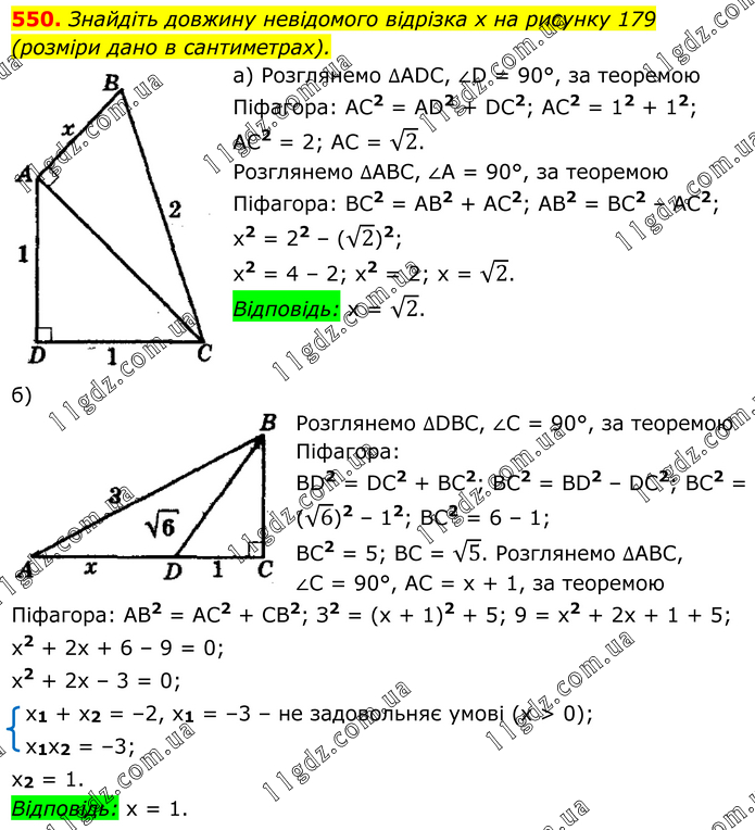 Знайдіть довжину невідомого відрізка х на рисунку 179 (розміри дано в сантиметрах). а) Розглянемо ∆АDС, ∠D = 90°, за теоремою Піфагора: АС2 = АD2 + DС2; АС2 = 12 + 12; АС2 = 2; АС = √2. Розглянемо ∆АВС, ∠А = 90°, за теоремою Піфагора: ВС2 = АВ2 + АС2; АВ2 = ВС2 – АС2; х2 = 22 – (√2)2; х2 = 4 – 2; х2 = 2; х = √2. Відповідь: х = √2. б) Розглянемо ∆DВС, ∠C = 90°, за теоремою Піфагора: ВD2 = DС2 + ВС2; ВС2 = ВD2 – DС2; ВС2 = (√6)2 – 12; ВС2 = 6 – 1; ВС2 = 5; ВС = √5. Розглянемо ∆АВС, ∠С = 90°, АС = х + 1, за теоремою Піфагора: АВ2 = АС2 + СВ2; З2 = (х + 1)2 + 5; 9 = х2 + 2х + 1 + 5; х2 + 2х + 6 – 9 = 0; х2 + 2x – 3 = 0; x1 + x2 = –2, x1 = –3 – не задовольняє умові (х > 0); x1х2 = –3; x2 = 1. Відповідь: х = 1.