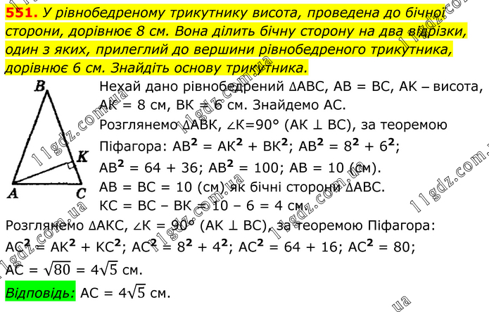 У рівнобедреному трикутнику висота, проведена до бічної сторони, дорівнює 8 см. Вона ділить бічну сторону на два відрізки, один з яких, прилеглий до вершини рівнобедреного трикутника, дорівнює 6 см. Знайдіть основу трикутника. Нехай дано рівнобедрений ∆АВС, АВ = ВС, АK – висота, АК = 8 см, ВК = 6 см. Знайдемо АС. Розглянемо ∆АВК, ∠К=90° (АК ⊥ ВС), за теоремою Піфагора: АВ2 = АК2 + ВК2; АВ2 = 82 + 62; АВ2 = 64 + 36; АВ2 = 100; АВ = 10 (см). АВ = ВС = 10 (см) як бічні сторони ∆АВС. КС = ВС – ВК = 10 – 6 = 4 см. Розглянемо ∆АКС, ∠К = 90° (АK ⊥ ВС), за теоремою Піфагора: АС2 = АK2 + KС2; АС2 = 82 + 42; АС2 = 64 + 16; АС2 = 80; АС = √80 = 4√5 см. Відповідь: АС = 4√5 см.