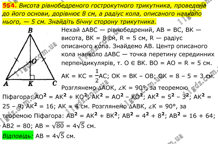 Висота рівнобедреного гострокутного трикутника, проведена до його основи, дорівнює 8 см, а радіус кола, описаного навколо нього, — 5 см. Знайдіть бічну сторону трикутника. Нехай ∆АВС — рівнобедрений, АВ = ВС, ВK — висота, ВК = 8 см, R = 5 см, R — радіус описаного кола. Знайдемо АВ. Центр описаного кола навколо ∆АВС — точка перетину серединних перпендикулярів, т. О ∈ ВК. BO = AO = R = 5 см. АК = KC = 1/2AC; OK = ВК – OB; ОК = 8 – 5 = 3 см. Розглянемо ∆АОК, ∠K = 90°, за теоремою Піфагора: АО2 = АК2 + КО2; АК2 = АО2 – КО2; АК2 = 52 – З2; АК2 = 25 – 9; АК2 = 16; АК = 4 см. Розглянемо ∆АВК, ∠К = 90°, за теоремою Піфагора: АВ2 = АK2 + ВК2; АВ2 = 42 + 82; АВ2 = 16 + 64; АВ2 = 80; АВ = √80 = 4√5 см. Відповідь: АВ = 4√5 см.