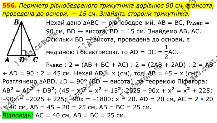 Периметр рівнобедреного трикутника дорівнює 90 см, а висота, проведена до основи, — 15 см. Знайдіть сторони трикутника. Нехай дано ∆АВС — рівнобедрений. АВ = ВС, Р∆АВС = 90 см, ВD — висота, ВD = 15 см. Знайдемо АВ, АС. Оскільки ВD — висота, проведена до основи, є медіаною і бісектрисою, то АD = DС = 1/2АС. Р∆АВС : 2 = (АВ + ВС + АС) : 2 = (2АВ + 2АD) : 2 = AB + AD = 90 : 2 = 45 см. Нехай АD = х (см), тоді АВ = 45 – х (см). Розглянемо ∆АВD, ∠D = 90° (ВD — висота), за теоремою Піфагора: АВ2 = АD2 + DВ2; (45 – х)2 = x2 + 152; 2025 – 90x + х2 = х2 + 225; –90x = –2025 + 225; –90x = –1800; х = 20. АD = 20 см, АС = 2 • 20 = 40 см, АВ = 45 – 20 = 25 см, АВ = ВС = 25 см. Відповідь: АС = 40 см, АВ = ВС = 25 см.