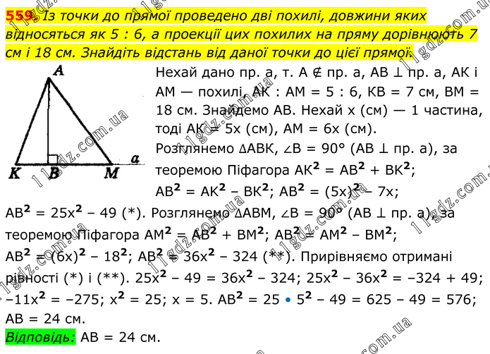 Із точки до прямої проведено дві похилі, довжини яких відносяться як 5 : 6, а проекції цих похилих на пряму дорівнюють 7 см і 18 см. Знайдіть відстань від даної точки до цієї прямої. Нехай дано пр. а, т. А ∉ пр. а, АВ ⊥ пр. а, АК і АМ — похилі, АК : АМ = 5 : 6, КВ = 7 см, ВМ = 18 см. Знайдемо АВ. Нехай х (см) — 1 частина, тоді АК = 5х (см), АМ = 6х (см). Розглянемо ∆АВК, ∠В = 90° (АВ ⊥ пр. а), за теоремою Піфагора АК2 = АВ2 + ВK2; АВ2 = АK2 – ВК2; АВ2 = (5x)2 – 7x; АВ2 = 25x2 – 49 (*). Розглянемо ∆АВМ, ∠В = 90° (АВ ⊥ пр. а), за теоремою Піфагора АМ2 = АВ2 + ВМ2; АВ2 = АМ2 – ВМ2; АВ2 = (6х)2 – 182; АВ2 = 36x2 – 324 (**). Прирівняємо отримані рівності (*) і (**). 25x2 – 49 = 36x2 – 324; 25x2 – 36x2 = –324 + 49; –11x2 = –275; x2 = 25; x = 5. АВ2 = 25 • 52 – 49 = 625 – 49 = 576; АВ = 24 см. Відповідь: АВ = 24 см.