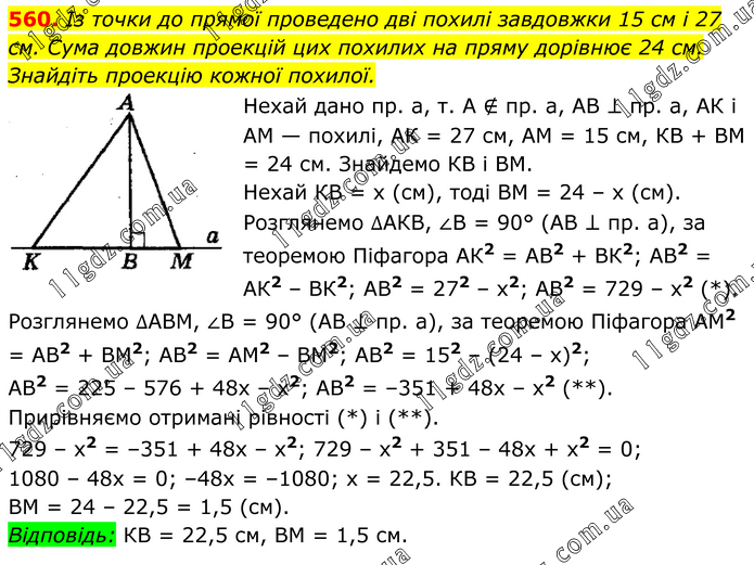 Із точки до прямої проведено дві похилі завдовжки 15 см і 27 см. Сума довжин проекцій цих похилих на пряму дорівнює 24 см. Знайдіть проекцію кожної похилої. Нехай дано пр. а, т. А ∉ пр. а, АВ ⊥ пр. а, АК і АМ — похилі, АК = 27 см, АМ = 15 см, КВ + ВМ = 24 см. Знайдемо КВ і ВМ. Нехай КВ = х (см), тоді ВМ = 24 – х (см). Розглянемо ∆АКВ, ∠В = 90° (АВ ⊥ пр. a), за теоремою Піфагора АК2 = АВ2 + ВК2; АВ2 = АК2 – ВК2; АВ2 = 272 – х2; АВ2 = 729 – x2 (*). Розглянемо ∆АВМ, ∠В = 90° (АВ ⊥ пр. a), за теоремою Піфагора АМ2 = АВ2 + ВМ2; АВ2 = АМ2 – ВМ2; АВ2 = 152 – (24 – х)2; АВ2 = 225 – 576 + 48x – х2; АВ2 = –351 + 48х – x2 (**). Прирівняємо отримані рівності (*) і (**). 729 – x2 = –351 + 48x – х2; 729 – х2 + 351 – 48x + х2 = 0; 1080 – 48x = 0; –48x = –1080; x = 22,5. КВ = 22,5 (см); ВМ = 24 – 22,5 = 1,5 (см). Відповідь: КВ = 22,5 см, ВМ = 1,5 см.