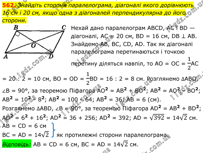 Знайдіть сторони паралелограма, діагоналі якого дорівнюють 16 см і 20 см, якщо одна з діагоналей перпендикулярна до його сторони. Нехай дано паралелограм АВСD, АС і ВD — діагоналі, АС = 20 см, ВD = 16 см, DВ ⊥ АВ. Знайдемо АВ, ВС, СD, АD. Так як діагоналі паралелограма перетинаються і точкою перетину діляться навпіл, то АО = ОС = 1/2АС = 20 : 2 = 10 см, ВО = ОD = 1/2ВD = 16 : 2 = 8 см. Розглянемо ∆АВО, ∠В = 90°, за теоремою Піфагора АО2 = АВ2 + ВО2; АВ2 = АО2 – ВО2; АВ2 = 102 – 82; АВ2 = 100 – 64; АВ2 = 36; АВ = 6 (см). Розглянемо ∆АВD, ∠В = 90°, за теоремою Піфагора АD2 = АВ2 + ВD2; АD2 = 62 + 162; АD2 = 36 + 256; АD2 = 392; АD = √392 = 14√2 см. АВ = СD = 6 см ВС = АD = 14√2 як протилежні сторони паралелограма. Відповідь: АВ = СD = 6 см, ВС = АD = 14√2 см.