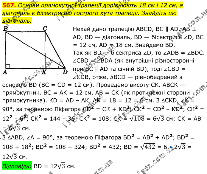 Основи прямокутної трапеції дорівнюють 18 см і 12 см, а діагональ є бісектрисою гострого кута трапеції. Знайдіть цю діагональ. Нехай дано трапецію АВСD, ВС ∥ АD, АВ ⊥ АD, ВD — діагональ, ВD — бісектриса ∠D, ВС = 12 см, АD = 18 см. Знайдемо ВD. Так як ВD — бісектриса ∠D, то ∠АDВ = ∠ВDС. ∠СВD = ∠ВDА (як внутрішні різносторонні при ВС ∥ АD та січній ВD), тоді ∠СВD = ∠СDВ, отже, ∆ВСD — рівнобедрений з основою ВD (ВС = СD = 12 см). Проведемо висоту СК. АВСК — прямокутник. ВС = АК = 12 см, АВ = СК (як протилежні сторони прямокутника). КD = АD – АК, АК = 18 = 12 = 6 см. З ∆СКD, ∠К = 90°, за теоремою Піфагора СD2 = СК + КD2; СК2 = СD2 – КD2; СК2 = 122 – 62; СК2 = 144 – 36; СК2 = 108; СК = √108 = 6√3 см; СК = АВ = 6√3 см. З ∆АВD, ∠А = 90°, за теоремою Піфагора ВD2 = АВ2 + АD2; ВD2 = 108 + 182; ВD2 = 108 + 324; ВD2 = 432; ВD = √432 = 6 • 2√3 = 12√3 см. Відповідь: ВD = 12√3 см.