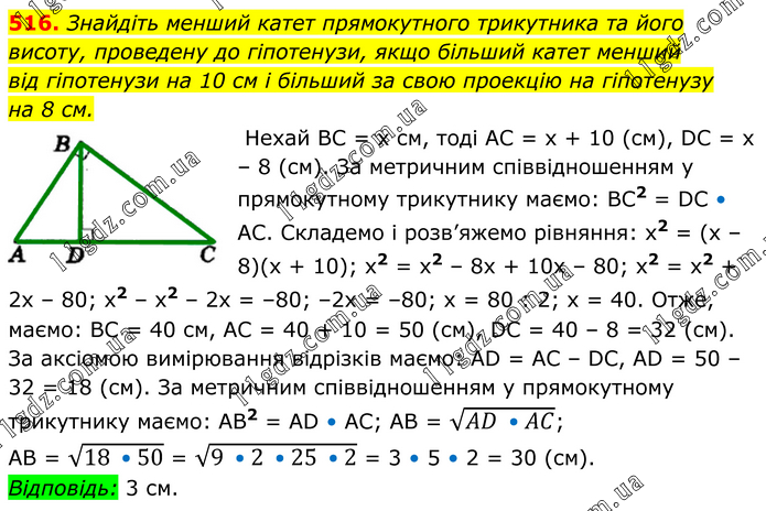 Знайдіть менший катет прямокутного трикутника та його висоту, проведену до гіпотенузи, якщо більший катет менший від гіпотенузи на 10 см і більший за свою проекцію на гіпотенузу на 8 см. Нехай ВС = х см, тоді АС = х + 10 (см), DС = х – 8 (см). За метричним співвідношенням у прямокутному трикутнику маємо: ВС2 = DС • АС. Складемо і розв’яжемо рівняння: х2 = (х – 8)(х + 10); х2 = х2 – 8х + 10x – 80; х2 = х2 + 2х – 80; х2 – х2 – 2х = –80; –2х = –80; х = 80 : 2; х = 40. Отже, маємо: ВС = 40 см, АС = 40 + 10 = 50 (см), DС = 40 – 8 = 32 (см). За аксіомою вимірювання відрізків маємо: АD = АС – DС, АD = 50 – 32 = 18 (см). За метричним співвідношенням у прямокутному трикутнику маємо: АВ2 = АD • АС; АВ = √(AD •AC); АВ = √(18 •50) = √(9 •2 •25 •2) = 3 • 5 • 2 = 30 (см). Відповідь: 3 см.