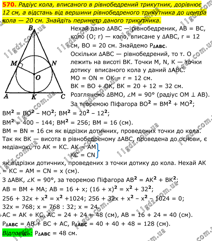 Радіус кола, вписаного в рівнобедрений трикутник, дорівнює 12 см, а відстань від вершини рівнобедреного трикутника до центра кола — 20 см. Знайдіть периметр даного трикутника. Нехай дано ∆АВС — рівнобедреник, АВ = ВС, коло (О; r) — коло, вписане у ∆АВС, r = 12 см, ВО = 20 см. Знайдемо Р∆ABC. Оскільки ∆АВС — рівнобедрений, то т. О лежить на висоті ВК. Точки М, N, К — точки дотику вписаного кола у даний ∆АВС. МО = ОN = ОК = r = 12 см. ВК = ВО + ОК, ВК = 20 + 12 = 32 см. Розглянемо ∆ВМО, ∠М = 90° (радіус ОМ ⊥ АВ). За теоремою Піфагора ВО2 = ВМ2 + МО2; ВМ2 = ВО2 – МО2; ВМ2 = 202 – 122; ВМ2 = 400 – 144; ВМ2 = 256; ВМ = 16 (см). ВМ = ВN = 16 см як відрізки дотичних, проведених точки до кола. Так як ВК — висота в рівнобедреному ∆АВС, проведена до основи, є медіаною, то АК = КС. АК = АМ KC = CN як відрізки дотичних, проведених з точки дотику до кола. Нехай АК = КС = АМ = СN = х (см). З ∆АВК, ∠К = 90°, за теоремою Піфагора АВ2 = АК2 + ВК2; АВ = ВМ + МА; АВ = 16 + х; (16 + x)2 = х2 + 322; 256 + 32x + х2 = x2 +1024; 256 + 32x + х2 – х2 – 1024 = 0; 32x = 768; x = 768 : 32; x = 24. АС = АК + КС, АС = 24 + 24 = 48 (см), АВ = 16 + 24 = 40 (см). P∆ABC = AB + BC + AC, P∆ABC = 40 + 40 + 48 = 128 (см). Відповідь: P∆ABC = 48 см.