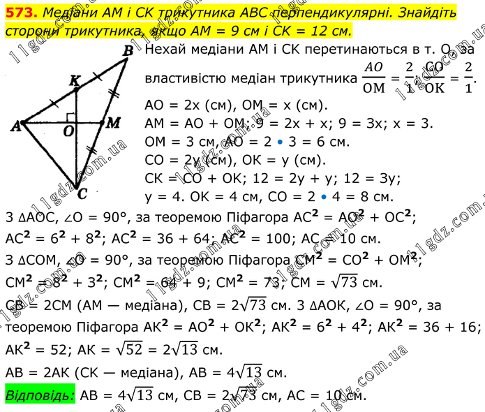 Медіани AM і CK трикутника ABC перпендикулярні. Знайдіть сторони трикутника, якщо AM = 9 см і CK = 12 см. Нехай медіани АМ і СK перетинаються в т. О, за властивістю медіан трикутника AO/OM = 2/1; CO/OK = 2/1. АО = 2х (см), ОМ = x (см). АМ = АО + ОМ; 9 = 2x + х; 9 = Зх; х = 3. ОМ = 3 см, АО = 2 • 3 = 6 см. СО = 2у (см), ОК = у (см). СК = СО + ОK; 12 = 2у + у; 12 = Зу; у = 4. ОK = 4 см, СО = 2 • 4 = 8 см. 3 ∆АОС, ∠О = 90°, за теоремою Піфагора АС2 = АО2 + ОС2; АС2 = 62 + 82; АС2 = 36 + 64; АС2 = 100; АС = 10 см. З ∆СОМ, ∠О = 90°, за теоремою Піфагора СМ2 = СО2 + ОМ2; СМ2 = 82 + З2; СМ2 = 64 + 9; СМ2 = 73; СМ = √73 см. СВ = 2СМ (АМ — медіана), СВ = 2√73 см. 3 ∆АОК, ∠О = 90°, за теоремою Піфагора АК2 = АО2 + ОК2; АК2 = 62 + 42; АК2 = 36 + 16; АК2 = 52; АК = √52 = 2√13 см. АВ = 2АК (СK — медіана), АВ = 4√13 см. Відповідь: АВ = 4√13 см, СВ = 2√73 см, АС = 10 см.
