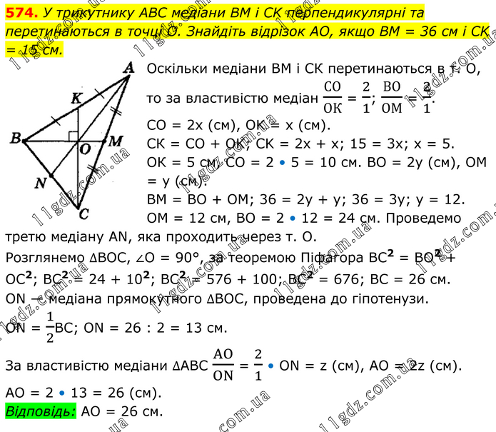 У трикутнику ABC медіани BM і CK перпендикулярні та перетинаються в точці О. Знайдіть відрізок AO, якщо BM = 36 см і CK = 15 см. Оскільки медіани ВМ і СК перетинаються в т. О, то за властивістю медіан СО/ОК = 2/1; ВО/ОМ = 2/1. СО = 2х (см), ОK = x (см). СК = СО + ОK; СK = 2x + x; 15 = 3x; x = 5. ОК = 5 см, СО = 2 • 5 = 10 см. ВО = 2у (см), ОМ = у (см). ВМ = ВО + ОМ; 36 = 2у + у; 36 = 3у; у = 12. ОМ = 12 см, ВО = 2 • 12 = 24 см. Проведемо третю медіану АN, яка проходить через т. О. Розглянемо ∆ВОС, ∠О = 90°, за теоремою Піфагора ВС2 = BO2 + OC2; ВС2 = 24 + 102; ВС2 = 576 + 100; ВС2 = 676; ВС = 26 см. ОN — медіана прямокутного ∆ВОС, проведена до гіпотенузи. ОN = 1/2ВС; ОN = 26 : 2 = 13 см. За властивістю медіани ∆АВС AO/ON = 2/1 • ОN = z (см), АО = 2z (см). АО = 2 • 13 = 26 (см). Відповідь: АО = 26 см.