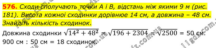 Сходи сполучають точки А і В, відстань між якими 9 м (рис. 181). Висота кожноi сходинки дорiвнюе 14 см, а довжина – 48 см. Знайдiть кiлькiсть сходинок. Довжина сходинки √(14^2+48^2 ) = √(196+2304) = √2500 = 50 см. 900 см : 50 см = 18 сходинок.
