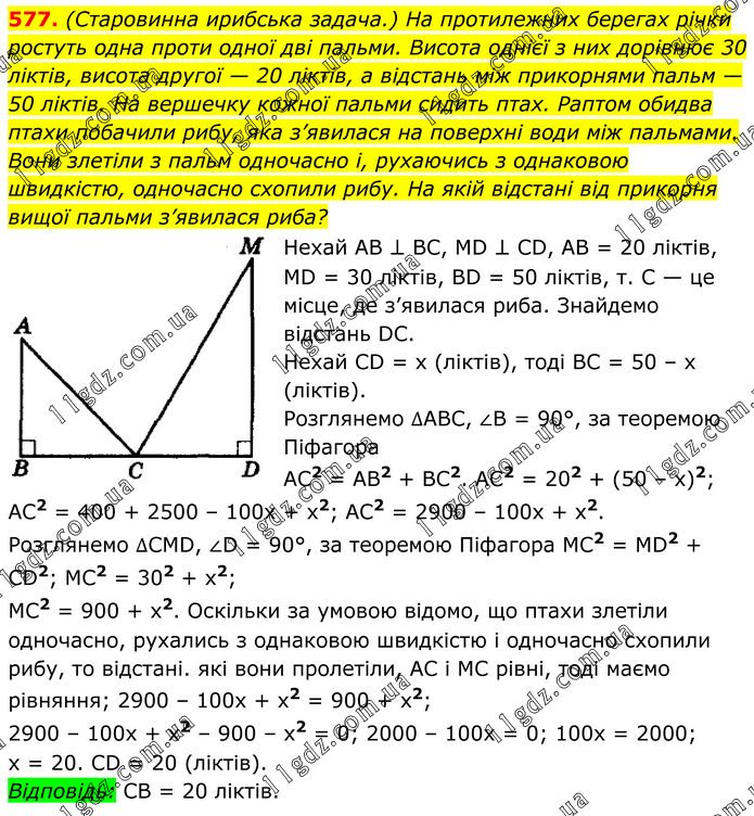 (Старовинна ирибська задача.) На протилежних берегах річки ростуть одна проти одної дві пальми. Висота однієї з них дорівнює 30 ліктів, висота другої — 20 ліктів, а відстань між прикорнями пальм — 50 ліктів. На вершечку кожної пальми сидить птах. Раптом обидва птахи побачили рибу, яка з’явилася на поверхні води між пальмами. Вони злетіли з пальм одночасно і, рухаючись з однаковою швидкістю, одночасно схопили рибу. На якій відстані від прикорня вищої пальми з’явилася риба? Нехай АВ ⊥ ВС, МD ⊥ СD, АВ = 20 ліктів, МD = 30 ліктів, ВD = 50 ліктів, т. С — це місце, де з’явилася риба. Знайдемо відстань DС. Нехай СD = х (ліктів), тоді ВС = 50 – х (ліктів). Розглянемо ∆АВС, ∠В = 90°, за теоремою Піфагора АС2 = АВ2 + ВС2. АС2 = 202 + (50 – х)2; АС2 = 400 + 2500 – 100x + х2; АС2 = 2900 – 100x + х2. Розглянемо ∆СМD, ∠D = 90°, за теоремою Піфагора МС2 = MD2 + СD2; МС2 = 302 + х2; МС2 = 900 + х2. Оскільки за умовою відомо, що птахи злетіли одночасно, рухались з однаковою швидкістю і одночасно схопили рибу, то відстані. які вони пролетіли, АС і МС рівні, тоді маємо рівняння; 2900 – 100х + х2 = 900 + х2; 2900 – 100x + х2 – 900 – х2 = 0; 2000 – 100х = 0; 100х = 2000; х = 20. СD = 20 (ліктів). Відповідь: СВ = 20 ліктів.