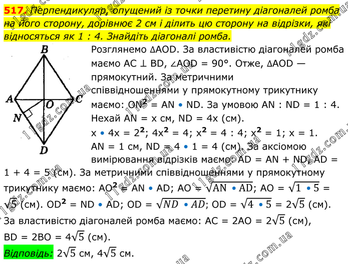 Перпендикуляр, опущений із точки перетину діагоналей ромба на його сторону, дорівнює 2 см і ділить цю сторону на відрізки, які відносяться як 1 : 4. Знайдіть діагоналі ромба. Розглянемо ∆АОD. За властивістю діагоналей ромба маємо АС ⊥ ВD, ∠АОD = 90°. Отже, ∆АОD — прямокутний. За метричними співвідношеннями у прямокутному трикутнику маємо: ON2 = АN • ND. За умовою АN : ND = 1 : 4. Нехай АN = х см, ND = 4х (см). х • 4х = 22; 4x2 = 4; x2 = 4 : 4; х2 = 1; х = 1. АN = 1 см, ND = 4 • 1 = 4 (см). За аксіомою вимірювання відрізків маємо: АD = АN + ND, АD = 1 + 4 = 5 (см). За метричними співвідношеннями у прямокутному трикутнику маємо: АО2 = АN • АD; АО = √(AN •AD); AO = √(1 •5) = √5 (см). ОD2 = ND • АD; ОD = √(ND •AD); ОD = √(4 •5) = 2√5 (см). За властивістю діагоналей ромба маємо: АС = 2АО = 2√5 (см), ВD = 2ВО = 4√5 (см). Відповідь: 2√5 см, 4√5 см.