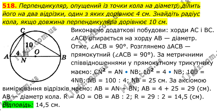Перпендикуляр, опущений із точки кола на діаметр, ділить його на два відрізки, один з яких дорівнює 4 см. Знайдіть радіус кола, якщо довжина перпендикуляра дорівнює 10 см. Виконаємо додаткові побудови: хорди АС і ВС. ∠ACB опирається на хорду АВ — діаметр. Отже, ∠АСВ = 90°. Розглянемо ∆АСВ — прямокутний (∠АСВ = 90°). За метричними співвідношеннями у прямокутному трикутнику маємо: СN2 = АN • NВ; 102 = 4 • NВ; 100 = 4NВ; NВ = 100 : 4; NВ = 25 см. За аксіомою вимірювання відрізків маємо: АВ = АN + ВN; АВ = 4 + 25 = 29 (см). АВ — діаметр кола. R = АО = ОВ = АВ : 2; R = 29 : 2 = 14,5 (см). Відповідь: 14,5 см.