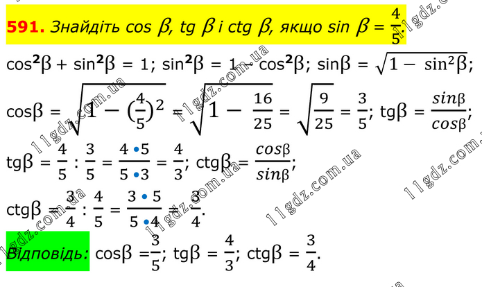 Знайдіть cos β, tg β і ctg β, якщо sin β = 4/5. cos2β + sin2β = 1; sin2β = 1 – cos2β; sinβ = √(1- sin^2 β); cosβ = √(1-(4/5 )^2 ) = √(1- 16/25) = √(9/25) = 3/5; tgβ = sinβ/cosβ; tgβ = 4/5 : 3/5 = (4 •5)/(5 •3) = 4/3; ctgβ = cosβ/sinβ; ctgβ = 3/4 : 4/5 = (3 • 5)/(5 •4) = 3/4. Відповідь: cosβ =3/5; tgβ = 4/3; ctgβ = 3/4.