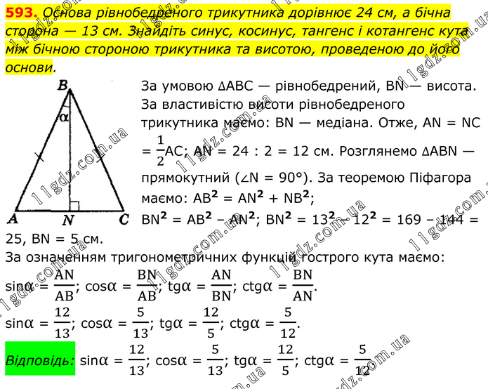 Основа рівнобедреного трикутника дорівнює 24 см, а бічна сторона — 13 см. Знайдіть синус, косинус, тангенс і котангенс кута між бічною стороною трикутника та висотою, проведеною до його основи. За умовою ∆АВС — рівнобедрений, ВN — висота. За властивістю висоти рівнобедреного трикутника маємо: ВN — медіана. Отже, AN = NC = 1/2AC; AN = 24 : 2 = 12 см. Розглянемо ∆ABN — прямокутний (∠N = 90°). За теоремою Піфагора маємо: АВ2 = AN2 + NB2; BN2 = AB2 – AN2; BN2 = 132 – 122 = 169 – 144 = 25, BN = 5 cм. За означенням тригонометричних функцій гострого кута маємо: sinα = AN/AB; cosα = BN/AB; tgα = AN/BN; ctgα = BN/AN. sinα = 12/13; cosα = 5/13; tgα = 12/5; ctgα = 5/12. Відповідь: sinα = 12/13; cosα = 5/13; tgα = 12/5; ctgα = 5/12.