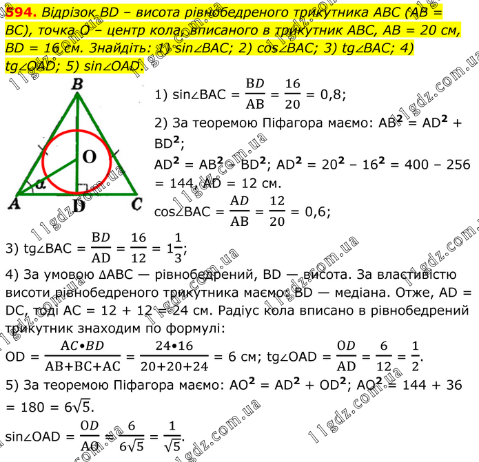 Вiдрiзок BD – висота рiвнобедреного трикутника АВС (АВ = ВС), точка О – центр кола, вписаного в трикутник АВС, АВ = 20 см, BD = 16 см. 3найдiть: 1) sin∠BAC; 2) cos∠BAC; 3) tg∠BAC; 4) tg∠OAD; 5) sin∠OAD. 1) sin∠BAC = BD/AB = 16/20 = 0,8; 2) За теоремою Піфагора маємо: АВ2 = AD2 + BD2; AD2 = AB2 – BD2; AD2 = 202 – 162 = 400 – 256 = 144, AD = 12 cм. cos∠BAC = AD/AB = 12/20 = 0,6; 3) tg∠BAC = BD/AD = 16/12 = 11/3; 4) За умовою ∆АВС — рівнобедрений, ВD — висота. За властивістю висоти рівнобедреного трикутника маємо: ВD — медіана. Отже, AD = DC, тоді АС = 12 + 12 = 24 см. Радіус кола вписано в рівнобедрений трикутник знаходим по формулі: OD = (AC•BD)/(AB+BC+AC) = (24•16)/(20+20+24) = 6 см; tg∠OAD = ОD/AD = 6/12 = 1/2. 5) За теоремою Піфагора маємо: АО2 = AD2 + ОD2; АО2 = 144 + 36 = 180 = 6√5. sin∠OAD = ОD/AО = 6/(6√5) = 1/√5.