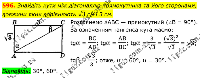Знайдіть кути між діагоналлю прямокутника та його сторонами, довжини яких дорівнюють √3 см і 3 см. Розглянемо ∆ABC — прямокутний (∠B = 90°). За означенням тангенса кута маємо: tgα = BC/AB; tgα = AB/BC; tgα = 3/√3 = ((√3 )^2)/√3 = √3; tgβ = √3/3; отже, α = 60°, α = 30°. Відповідь: 30°, 60°.