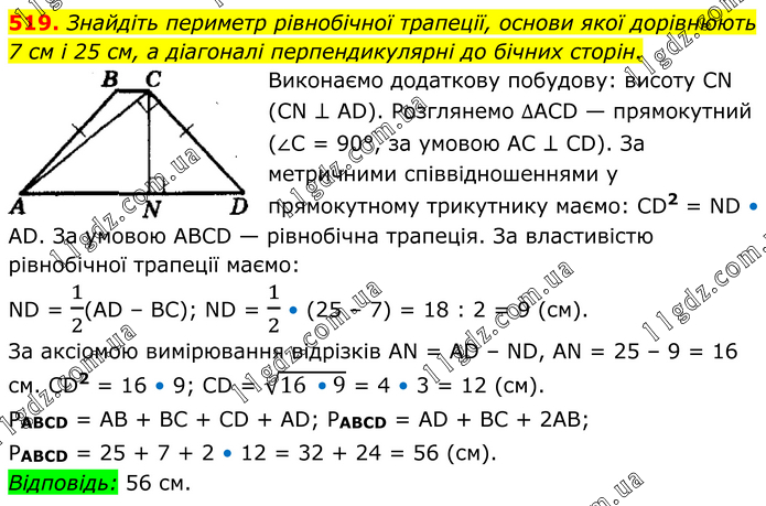 Знайдіть периметр рівнобічної трапеції, основи якої дорівнюють 7 см і 25 см, а діагоналі перпендикулярні до бічних сторін. Виконаємо додаткову побудову: висоту CN (CN ⊥ АD). Розглянемо ∆АСD — прямокутний (∠С = 90°, за умовою АС ⊥ СD). За метричними співвідношеннями у прямокутному трикутнику маємо: СD2 = ND • АD. За умовою АВСD — рівнобічна трапеція. За властивістю рівнобічної трапеції маємо: ND = 1/2(AD – ВС); ND = 1/2 • (25 – 7) = 18 : 2 = 9 (см). За аксіомою вимірювання відрізків АN = АD – ND, АN = 25 – 9 = 16 см. СD2 = 16 • 9; CD = √(16 •9) = 4 • 3 = 12 (см). РABCD = АВ + ВС + СD + АD; РABCD = AD + ВС + 2АВ; РABCD = 25 + 7 + 2 • 12 = 32 + 24 = 56 (см). Відповідь: 56 см.