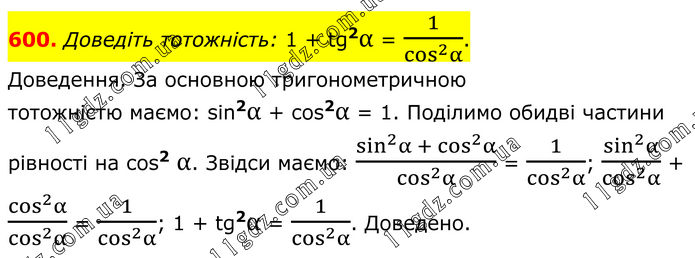 600. Доведіть тотожність: 1 + tg2α = 1/(cos^2 α). Доведення. За основною тригонометричною тотожністю маємо: sin2α + cos2α = 1. Поділимо обидві частини рівності на cos2 α. Звідси маємо: (sin^2 α + cos^2 α)/(cos^2 α) = 1/(cos^2 α); (sin^2 α)/(cos^2 α) + (cos^2 α)/(cos^2 α) = 1/(cos^2 α); 1 + tg2α = 1/(cos^2 α). Доведено.