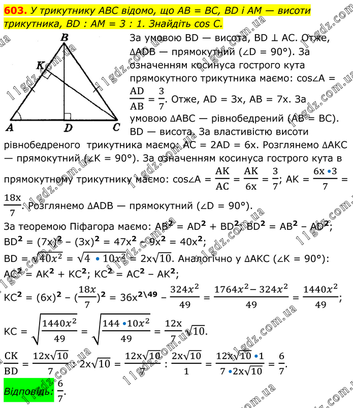 У трикутнику ABC відомо, що AB = BC, BD і AM — висоти трикутника, BD : AM = 3 : 1. Знайдіть cos С. За умовою ВD — висота, ВD ⊥ АС. Отже, ∆АDВ — прямокутний (∠D = 90°). За означенням косинуса гострого кута прямокутного трикутника маємо: cos∠A = AD/AB = 3/7. Отже, AD = Зх, АВ = 7х. За умовою ∆ABC — рівнобедрений (АВ = ВС). ВD — висота. За властивістю висоти рівнобедреного трикутника маємо: АС = 2AD = 6x. Розглянемо ∆АKС — прямокутний (∠K = 90°). За означенням косинуса гострого кута в прямокутному трикутнику маємо: cos∠A = AK/AC = AK/6x = 3/7; AK = (6x •3)/7 = 18x/7. Розглянемо ∆ADB — прямокутний (∠D = 90°). За теоремою Піфагора маємо: АВ2 = AD2 + ВD2; BD2 = АВ2 – AD2; BD2 = (7х)2 – (Зх)2 = 47х2 – 9х2 = 40х2; BD = √(40x^2 ) = √(4 •10x^2 ) = 2х√10. Аналогічно у ∆АKС (∠K = 90°): АС2 = АK2 + KС2; KС2 = АС2 – АK2; KC2 = (6x)2 – (18x/7)2 = 36x2\49 – (324x^2)/49 = (1764x^2- 324x^2)/49 = (1440x^2)/49; KC = √((1440x^2)/49) = √((144 •10x^2)/49) = 12x/7 √10. CK/BD = (12x√10)/7 : 2x√10 = (12x√10)/7 : (2x√10)/1 = (12x√10 •1)/( 7 •2x√10) = 6/7. Відповідь: 6/7.