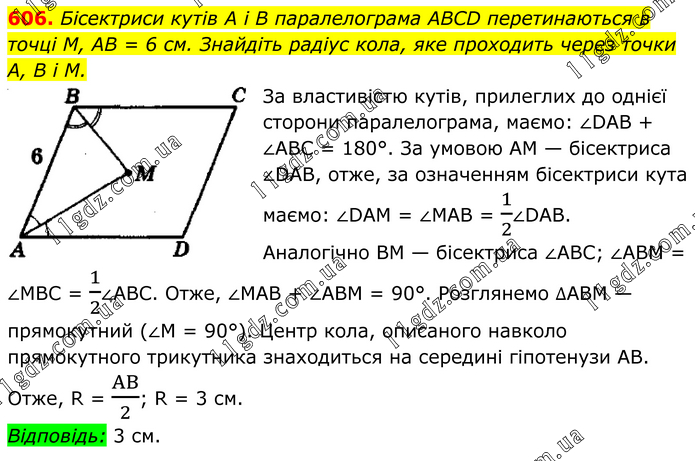Бісектриси кутів A i B паралелограма ABCD перетинаються в точці M, AB = 6 см. Знайдіть радіус кола, яке проходить через точки А, В і M. За властивістю кутів, прилеглих дo однієї сторони паралелограма, маємо: ∠DAB + ∠ABC = 180°. За умовою АМ — бісектриса ∠DАВ, отже, за означенням бісектриси кута маємо: ∠DAM = ∠МАВ = 1/2∠DAB. Аналогічно ВМ — бісектриса ∠АВС; ∠АВМ = ∠МВС = 1/2∠АВС. Отже, ∠МАВ + ∠АВМ = 90°. Розглянемо ∆АВМ — прямокутний (∠М = 90°). Центр кола, описаного навколо прямокутного трикутника знаходиться на середині гіпотенузи АВ. Отже, R = AB/2; R = 3 см. Відповідь: 3 см.