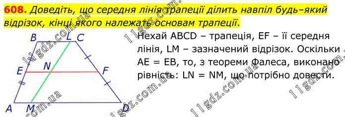 Доведiть, що середня лiнiя трапеції дiлить навпiл будь–який вiдрiзок, кiнцi якого належать основам трапеції. Нехай ABCD – трапеція, EF – її середня лінія, LM – зазначений відрізок. Оскільки AE = EB, то, з теореми Фалеса, виконано рівність: LN = NM, що потрібно довести.