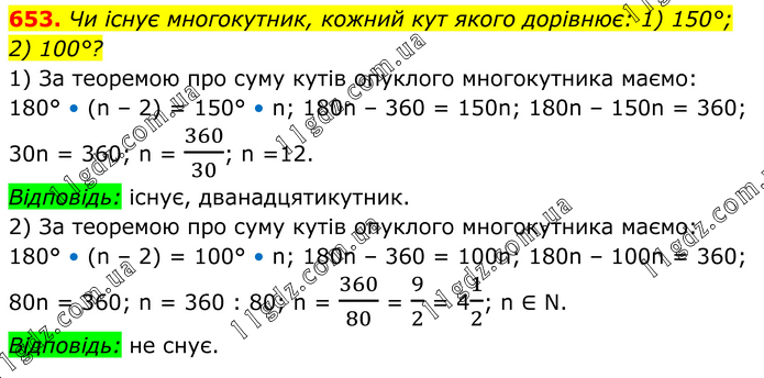Чи існує многокутник, кожний кут якого дорівнює: 1) 150°; 2) 100°? 1) За теоремою про суму кутів опуклого многокутника маємо: 180° • (n – 2) = 150° • n; 180n – 360 = 150n; 180n – 150n = 360; 30n = 360; n = 360/30; n =12. Відповідь: існує, дванадцятикутник. 2) За теоремою про суму кутів опуклого многокутника маємо: 180° • (n – 2) = 100° • n; 180n – 360 = 100n; 180n – 100n = 360; 80n = 360; n = 360 : 80; n = 360/80 = 9/2 = 41/2; n ∈ N. Відповідь: не снує.