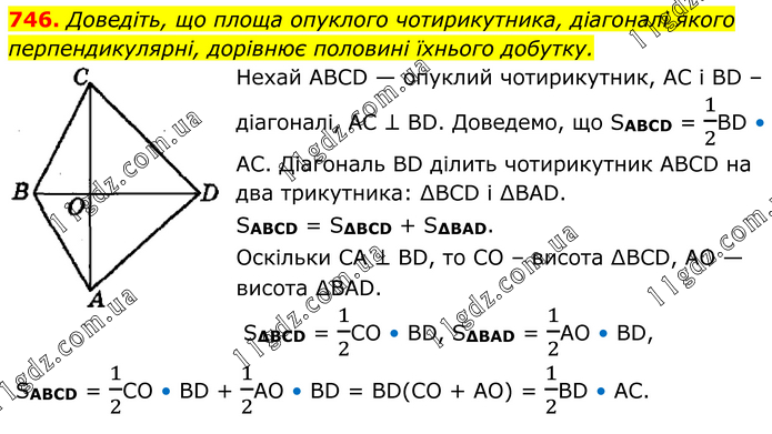 Доведіть, що площа опуклого чотирикутника, діагоналі якого перпендикулярні, дорівнює половині їхнього добутку. Нехай АВСD — опуклий чотирикутник, АС і ВD – діагоналі, АС ⊥ ВD. Доведемо, що SABCD = 1/2ВD • АС. Діагональ ВD ділить чотирикутник АВСD на два трикутника: ∆ВСD і ∆ВАD. SABCD = S∆BCD + S∆BAD. Оскільки СА ⊥ ВD, то СО – висота ∆BCD, АО — висота ∆ВАD. S∆BCD = 1/2CO • BD, S∆BAD = 1/2AO • BD, SABCD = 1/2CO • BD + 1/2AO • BD = BD(CO + AO) = 1/2BD • AC.