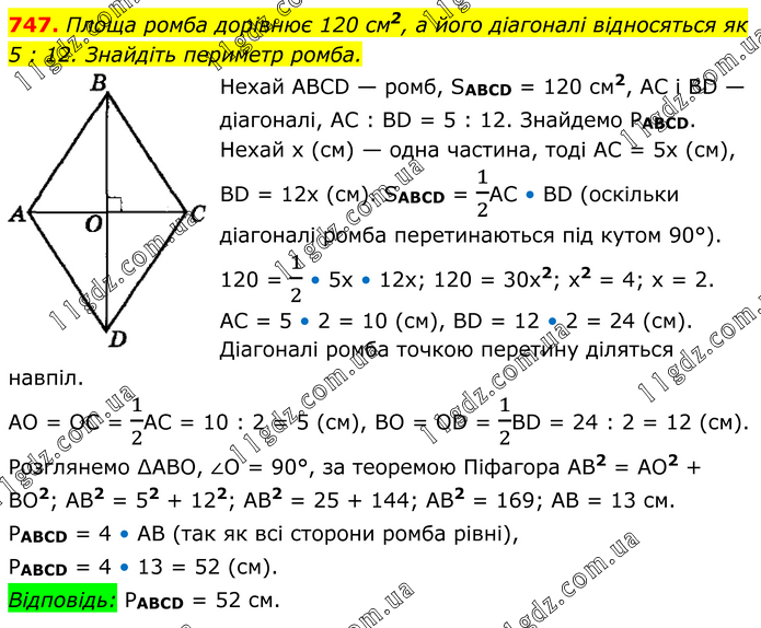 Площа ромба дорівнює 120 см2, а його діагоналі відносяться як 5 : 12. Знайдіть периметр ромба. Нехай АВСD — ромб, SABCD = 120 см2, АС і ВD — діагоналі, АС : ВD = 5 : 12. Знайдемо PABCD. Нехай х (см) — одна частина, тоді АС = 5х (см), ВD = 12х (см). SABCD = 1/2АС • ВD (оскільки діагоналі ромба перетинаються під кутом 90°). 120 = 1/2 • 5х • 12х; 120 = 30x2; x2 = 4; х = 2. АС = 5 • 2 = 10 (см), ВD = 12 • 2 = 24 (см). Діагоналі ромба точкою перетину діляться навпіл. АО = ОС = 1/2АС = 10 : 2 = 5 (см), ВО = ОD = 1/2ВD = 24 : 2 = 12 (см). Розглянемо ∆АВО, ∠О = 90°, за теоремою Піфагора АВ2 = АО2 + ВО2; АВ2 = 52 + 122; АВ2 = 25 + 144; АВ2 = 169; АВ = 13 см. PABCD = 4 • АВ (так як всі сторони ромба рівні), PABCD = 4 • 13 = 52 (см). Відповідь: PABCD = 52 см.