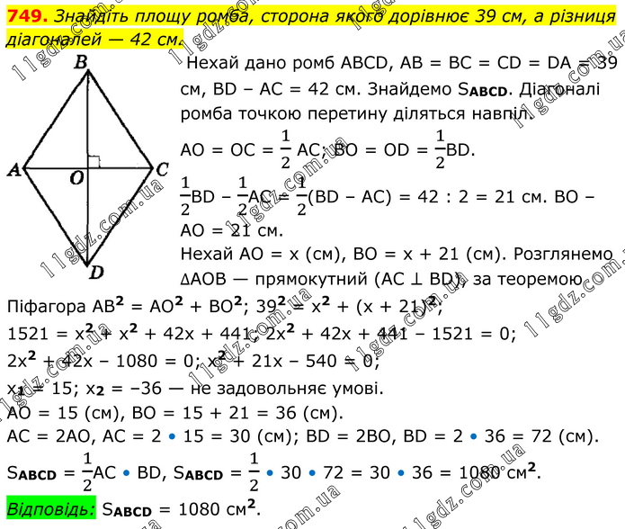 Знайдіть площу ромба, сторона якого дорівнює 39 см, а різниця діагоналей — 42 см. Нехай дано ромб АВСD, АВ = ВС = СD = DА = 39 см, ВD – АС = 42 см. Знайдемо SABCD. Діагоналі ромба точкою перетину діляться навпіл. АО = ОС = 1/2 АС; ВО = ОD = 1/2ВD. 1/2ВD – 1/2АС = 1/2(ВD – АС) = 42 : 2 = 21 см. ВО – АО = 21 см. Нехай АО = x (см), ВО = x + 21 (см). Розглянемо ∆АОВ — прямокутний (АС ⊥ ВD), за теоремою Піфагора АВ2 = АО2 + ВО2; 392 = x2 + (x + 21)2; 1521 = x2 + x2 + 42x + 441; 2x2 + 42x + 441 – 1521 = 0; 2х2 + 42x – 1080 = 0; x2 + 21x – 540 = 0; x1 = 15; x2 = –36 — не задовольняє умові. АО = 15 (см), ВО = 15 + 21 = 36 (см). АС = 2АО, АС = 2 • 15 = 30 (см); ВD = 2ВО, ВD = 2 • 36 = 72 (см). SABCD = 1/2АС • ВD, SABCD = 1/2 • 30 • 72 = 30 • 36 = 1080 см2. Відповідь: SABCD = 1080 см2.