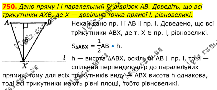 Дано пряму l і паралельний їй відрізок AB. Доведіть, що всі трикутники AXB, де X — довільна точка прямої l, рівновеликі. Нехай дано пр. l і АВ ∥ пр. l. Доведемо, що всі трикутники АВХ, де т. X ∈ пр. l, рівновеликі. S∆ABX = 1/2АВ • h. h — висота ∆АВХ, оскільки АВ ∥ пр. l, то h — cпільний перпендикуляр до паралельних прямих, тому для всіх трикутників виду — АВХ висота h однакова, тоді всі трикутники мають рівні площі, тобто рівновеликі.