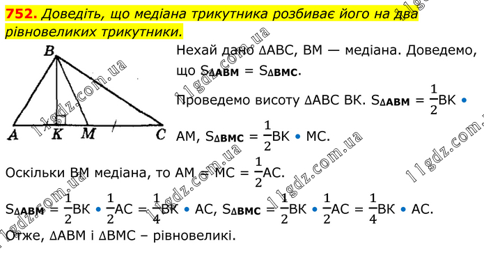 Доведіть, що медіана трикутника розбиває його на два рівновеликих трикутники. Нехай дано ∆АВС, ВM — медіана. Доведемо, що S∆ABM = S∆BMC. Проведемо висоту ∆АВС ВК. S∆ABM = 1/2BK • AM, S∆BMC = 1/2BK • МС. Оскільки ВМ медіана, то АМ = МС = 1/2АС. S∆ABM = 1/2ВК • 1/2АС = 1/4ВК • АС, S∆BMC = 1/2ВК • 1/2АС = 1/4ВК • АС. Отже, ∆АВМ і ∆ВМС – рівновеликі.