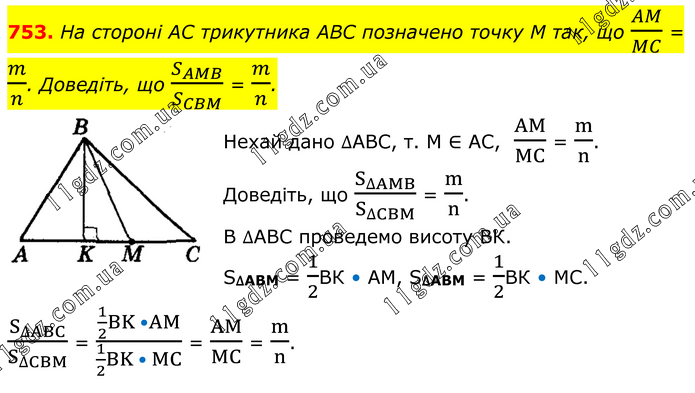 На стороні AC трикутника ABC позначено точку M так, що AM/MC = m/n. Доведіть, що S_AMB/S_CBM = m/n. Нехай дано ∆АВС, т. М ∈ АС, AM/MC = m/n. Доведіть, що S_∆AMB/S_∆CBM = m/n. В ∆АВС проведемо висоту ВК. S∆ABM = 1/2ВК • АМ, S∆ABM = 1/2ВК • МС. S_∆ABC/S_∆CBM = (1/2 BK •AM)/(1/2 BK • MC) = AM/MC = m/n.