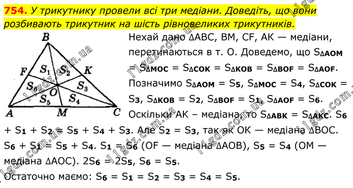 У трикутнику провели всі три медіани. Доведіть, що вони розбивають трикутник на шість рівновеликих трикутників. Нехай дано ∆АВС, ВМ, СF, АК — медіани, перетинаються в т. О. Доведемо, що S∆AOM = S∆MOC = S∆COK = S∆KOB = S∆BOF = S∆AOF. Позначимо S∆AOM = S5, S∆MOC = S4, S∆COK = S3, S∆KOB = S2, S∆BOF = S1, S∆AOF = S6. Оскільки AK – медіана, то S∆ABK = S∆AKC. S6 + S1 + S2 = S5 + S4 + S3. Але S2 = S3, так як ОК — медіана ∆ВОС. S6 + S1 = S5 + S4. S1 = S6 (ОF — медіана ∆АОВ), S5 = S4 (ОМ — медіана ∆АОС). 2S6 = 2S5, S6 = S5. Остаточно маємо: S6 = S1 = S2 = S3 = S4 = S5.
