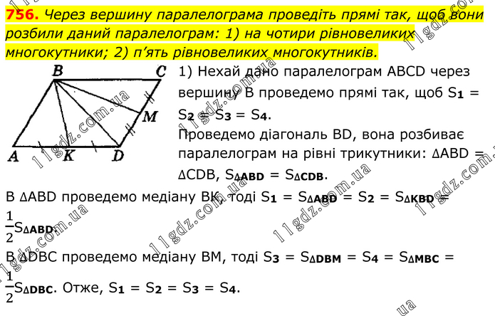 Через вершину паралелограма проведіть прямі так, щоб вони розбили даний паралелограм: 1) на чотири рівновеликих многокутники; 2) п’ять рівновеликих многокутників. 1) Нехай дано паралелограм АВСD через вершину В проведемо прямі так, щоб S1 = S2 = S3 = S4. Проведемо діагональ ВD, вона розбиває паралелограм на рівні трикутники: ∆АBD = ∆СDВ, S∆ABD = S∆CDB. В ∆АВD проведемо медіану ВК, тоді S1 = S∆ABD = S2 = S∆KBD = 1/2S∆ABD. В ∆DВС проведемо медіану ВМ, тоді S3 = S∆DBM = S4 = S∆MBC = 1/2S∆DBC. Отже, S1 = S2 = S3 = S4.