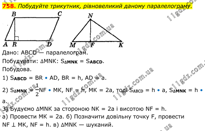 Побудуйте трикутник, рівновеликий даному паралелограму. Дано: АВСD — паралелограм. Побудувати: ∆МNК: S∆MNK = SABCD. Побудова. 1) SABCD = ВR • АD, ВR = h, АD = а. 2) S∆MNK = 1/2NF • МК, NF = h, МК = 2а, тоді SABCD = h • a, S∆MNK = h • a. 3) Будуємо ∆МNК за стороною NК = 2а і висотою NF = h. а) Провести МК = 2а. б) Позначити довільну точку F, провести NF ⊥ МK, NF = h. в) ∆МNК — шуканий.