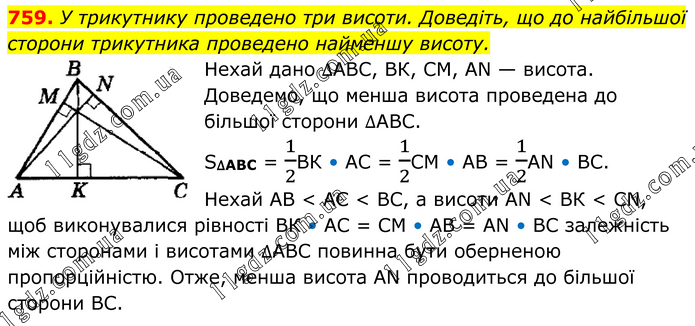 У трикутнику проведено три висоти. Доведіть, що до найбільшої сторони трикутника проведено найменшу висоту. Нехай дано ∆АВС, ВК, СМ, АN — висота. Доведемо, що менша висота проведена до більшої сторони ∆АВС. S∆ABC = 1/2ВК • АС = 1/2СМ • АВ = 1/2AN • BC. Нехай АВ < АС < ВС, а висоти АN < ВК < СN, щоб виконувалися рівності ВК • АС = СМ • АВ = АN • ВС залежність між сторонами і висотами ∆АВС повинна бути оберненою пропорційністю. Отже, менша висота АN проводиться до більшої сторони ВС.