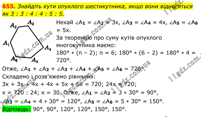 Знайдіть кути опуклого шестикутника, якщо вони відносяться як 3 : 3 : 4 : 4 : 5 : 5. Нехай ∠А1 = ∠А2 = Зх, ∠А3 = ∠А4 = 4х, ∠А5 = ∠А6 = 5х. За теоремою про суму кутів опуклого многокутника маємо: 180° • (n – 2); n = 6; 180° • (6 – 2) = 180° • 4 = 720°. Отже, ∠А1 + ∠А2 + ∠А3 + ∠А4 + ∠А5 + ∠А6 = 720°. Складемо і розв’яжемо рівняння: Зх + Зх + 4х + 4х + 5х + 5х = 720; 24x = 720; х = 720 : 24; х = 30. Отже, ∠А1 = ∠А2 = 3 • 30° = 90°, ∠А3 = ∠А4 = 4 • 30° = 120°, ∠А5 = ∠А6 = 5 • 30° = 150°. Відповідь: 90°, 90°, 120°, 120°, 150°, 150°.