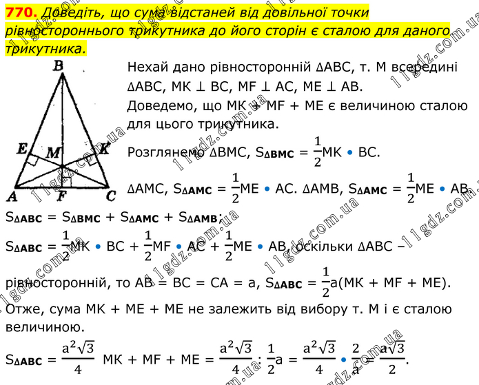 Доведіть, що сума відстаней від довільної точки рівностороннього трикутника до його сторін є сталою для даного трикутника. Нехай дано рівносторонній ∆АВС, т. М всередині ∆АВС, МК ⊥ ВС, МF ⊥ АС, МЕ ⊥ АВ. Доведемо, що МК + МF + МЕ є величиною сталою для цього трикутника. Розглянемо ∆BMC, S∆BMC = 1/2MK • BC. ∆AMC, S∆AMC = 1/2ME • AC. ∆AMB, S∆AMC = 1/2ME • AB. S∆ABC = S∆BMC + S∆AMC + S∆AMB; S∆ABC = 1/2MK • BC + 1/2MF • AC + 1/2ME • AB, оскільки ∆АВС – рівносторонній, то АВ = ВС = СА = a, S∆ABC = 1/2а(МК + MF + ME). Отже, сума MK + ME + ME не залежить від вибору т. М і є сталою величиною. S∆ABC = (a^2 √3)/4 МК + MF + ME = (a^2 √3)/4 : 1/2a = (a^2 √3)/4 • 2/a = (a√3)/2.