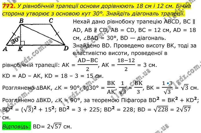 У рівнобічній трапеції основи дорівнюють 18 см і 12 см. Бічна сторона утворює з основою кут 30°. Знайдіть діагональ трапеції. Нехай дано рівнобоку трапецію ABCD, ВС ∥ АD, AB ∦ CD, АВ = CD, ВС = 12 см, АD = 18 см, ∠BAD = 30°, ВD — діагональ. Знайдемо ВD. Проведемо висоту ВК, тоді за властивістю висоти, проведеної в рівнобічній трапеції: АК = (AD-BC)/2, АК = (18-12)/2 = 3 см. KD = AD – AK, KD = 18 – 3 = 15 см. Розглянемо ∆ВАК, ∠К = 90°. tg30° = BK/AK, 1/√3 = BK/3, BK = (1 •3)/√3 = √3 см. Розглянемо ∆BKD, ∠К = 90°, за теоремою Піфагора ВD2 = ВК2 + KD2; ВD2 = (√3)2 + 152; ВD2 = 3 + 225; ВD2 = 228; ВD = √228 = 2√57 см. Відповідь: ВD= 2√57 см.