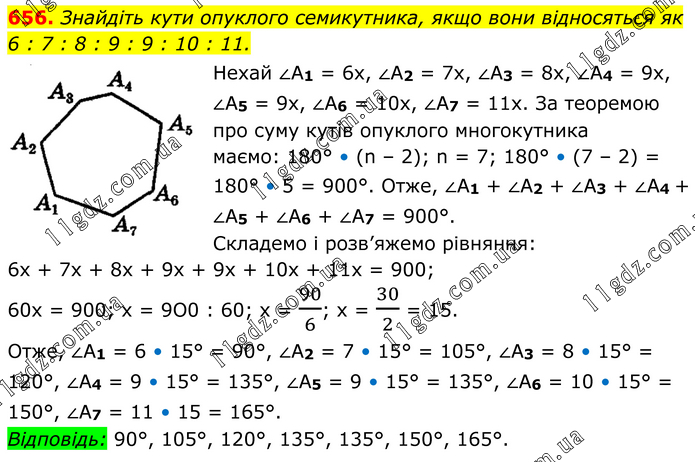 Знайдіть кути опуклого семикутника, якщо вони відносяться як 6 : 7 : 8 : 9 : 9 : 10 : 11. Нехай ∠А1 = 6х, ∠А2 = 7х, ∠А3 = 8х, ∠А4 = 9х, ∠А5 = 9х, ∠А6 = 10х, ∠А7 = 11х. За теоремою про суму кутів опуклого многокутника маємо: 180° • (n – 2); n = 7; 180° • (7 – 2) = 180° • 5 = 900°. Отже, ∠А1 + ∠А2 + ∠А3 + ∠А4 + ∠А5 + ∠А6 + ∠А7 = 900°. Складемо і розв’яжемо рівняння: 6х + 7х + 8х + 9х + 9х + 10х + 11х = 900; 60х = 900; х = 9О0 : 60; х = 90/6; х = 30/2 = 15. Отже, ∠А1 = 6 • 15° = 90°, ∠А2 = 7 • 15° = 105°, ∠А3 = 8 • 15° = 120°, ∠А4 = 9 • 15° = 135°, ∠А5 = 9 • 15° = 135°, ∠А6 = 10 • 15° = 150°, ∠А7 = 11 • 15 = 165°. Відповідь: 90°, 105°, 120°, 135°, 135°, 150°, 165°.