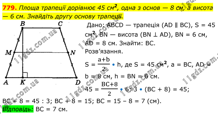 Площа трапеції дорівнює 45 см2, одна з основ — 8 см, а висота — 6 см. Знайдіть другу основу трапеції. Дано: АВСD — трапеція (АD ∥ ВС), S = 45 см2, ВN — висота (ВN ⊥ АD), ВN = 6 см, АD = 8 см. Знайти: ВС. Розв’язання. S = (a+b)/2 • h, де S = 45 см2, а = ВС, АD = b = 8 см, h = ВN = 6 см. 45 = (BC+8)/2 • 6; 3 • (ВС + 8) = 45; ВС + 8 = 45 : 3; ВС + 8 = 15; ВС = 15 – 8 = 7 (см). Відповідь: ВС = 7 см.