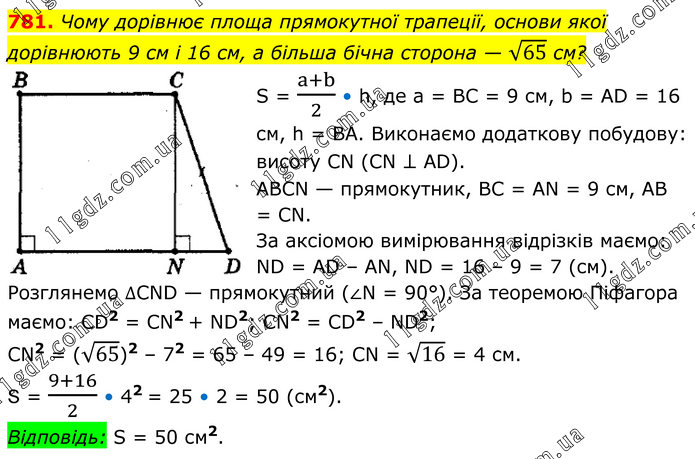 Чому дорівнює площа прямокутної трапеції, основи якої дорівнюють 9 см і 16 см, а більша бічна сторона — √65 см? S = (a+b)/2 • h, де а = ВС = 9 см, b = АD = 16 см, h = ВА. Виконаємо додаткову побудову: висоту СN (СN ⊥ АD). АВСN — прямокутник, ВС = АN = 9 см, АВ = СN. За аксіомою вимірювання відрізків маємо: ND = АD – АN, ND = 16 – 9 = 7 (см). Розглянемо ∆СND — прямокутний (∠N = 90°). За теоремою Піфагора маємо: СD2 = СN2 + ND2; СN2 = СD2 – ND2; СN2 = (√65)2 – 72 = 65 – 49 = 16; СN = √16 = 4 см. S = (9+16)/2 • 42 = 25 • 2 = 50 (см2). Відповідь: S = 50 см2.