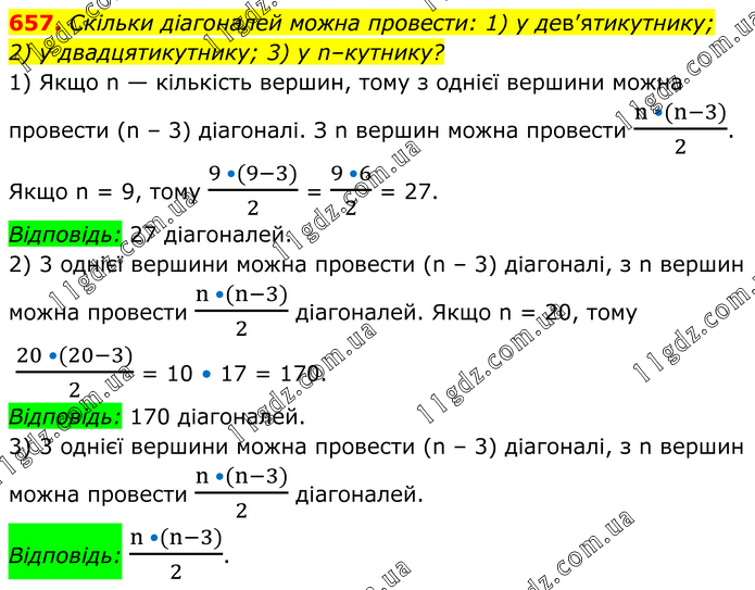 Скільки діагоналей можна провести: 1) у дев’ятикутнику; 2) у двадцятикутнику; 3) у n–кутнику? 1) Якщо n — кількість вершин, тому з однієї вершини можна провести (n – 3) діагоналі. З n вершин можна провести (n •(n-3))/2. Якщо n = 9, тому (9 •(9-3))/2 = (9 •6)/2 = 27. Відповідь: 27 діагоналей. 2) 3 однієї вершини можна провести (n – 3) діагоналі, з n вершин можна провести (n •(n-3))/2 діагоналей. Якщо n = 20, тому (20 •(20-3))/2 = 10 • 17 = 170. Відповідь: 170 діагоналей. 3) 3 однієї вершини можна провести (n – 3) діагоналі, з n вершин можна провести (n •(n-3))/2 діагоналей. Відповідь: (n •(n-3))/2.